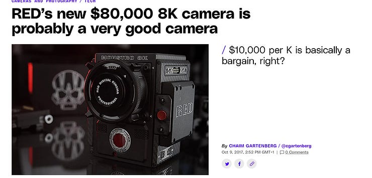 Here’s a 2017 ad for a RED, a very high-end professional video camera. $80,000 but, the ad notes, it does shoot in 4K!!