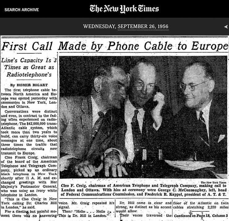 I had not realized how recent even the concept of an overseas phone call was until I saw the article from The NY Times above (courtesy of Kathy Gill, a very prolific writer about history and technology.) Today, my wife and I live in the UK, in a very small village in the middle of nowhere (population 92). Even so, we have an Internet connection that gets a blinding 1.5 gigs. My mother these days lives in Miami. Yet if we want to talk to her, all we have to do is get on FaceTime, and there she is, in video no less, and for no cost and instant.